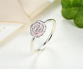 The ring showcases a delicate floral motif with soft pink enamel and a sparkling gemstone, creating an elegant and eye-catching look.